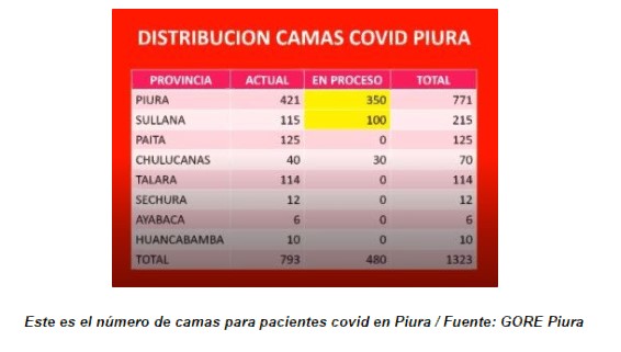 El director regional de Salud, Víctor Távara Córdova, anunció que en los próximos días se habilitarán 480 nuevas camas de hospitalización. Estas se sumarán a las 843 camas que actualmente hay en los hospitales de toda la región.