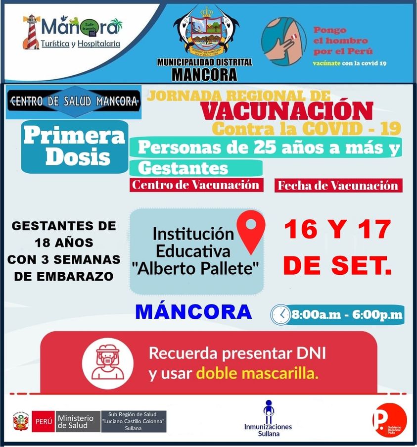 Continúa la vacunación en Máncora. Las personas de 25 años a más recibirán su primera dosis contra la covid este jueves 16 y viernes 17 de setiembre en las instalaciones de la I.E. Alberto Pallete.