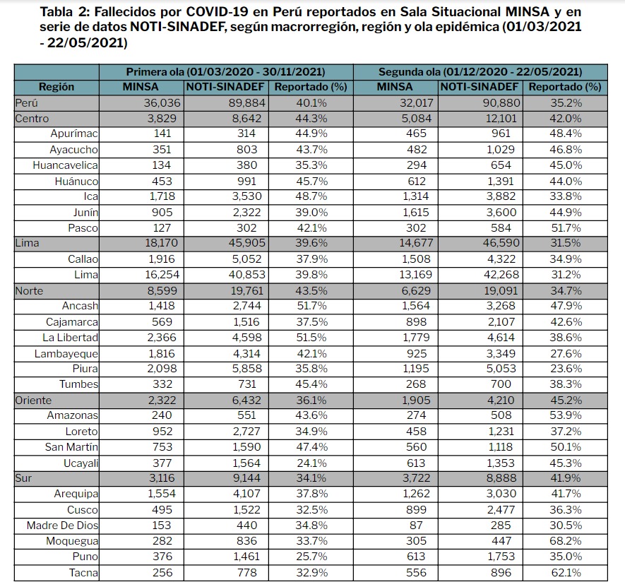 La data refleja que la cifra real de fallecidos triplica lo reportado por los órganos oficiales, como la Diresa. Además, en la primera ola (enero a noviembre) se reportaron 5858 fallecidos en ocho meses, mientras que en la segunda ola (diciembre a mayo) la cifra también supera los 5 mil fallecidos en tan solo seis meses.