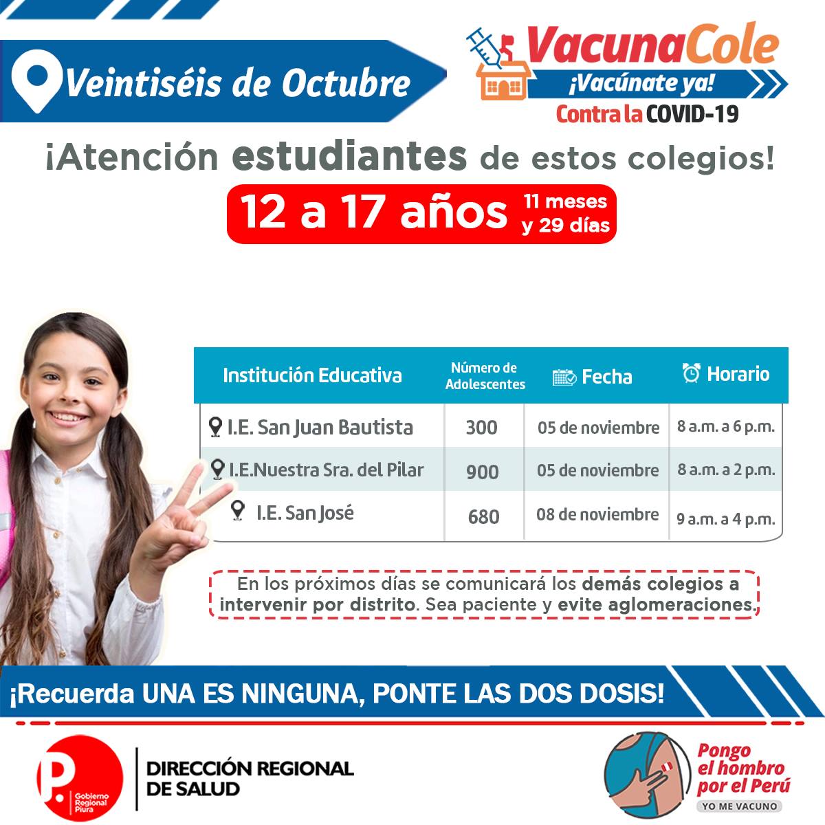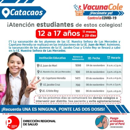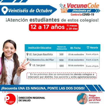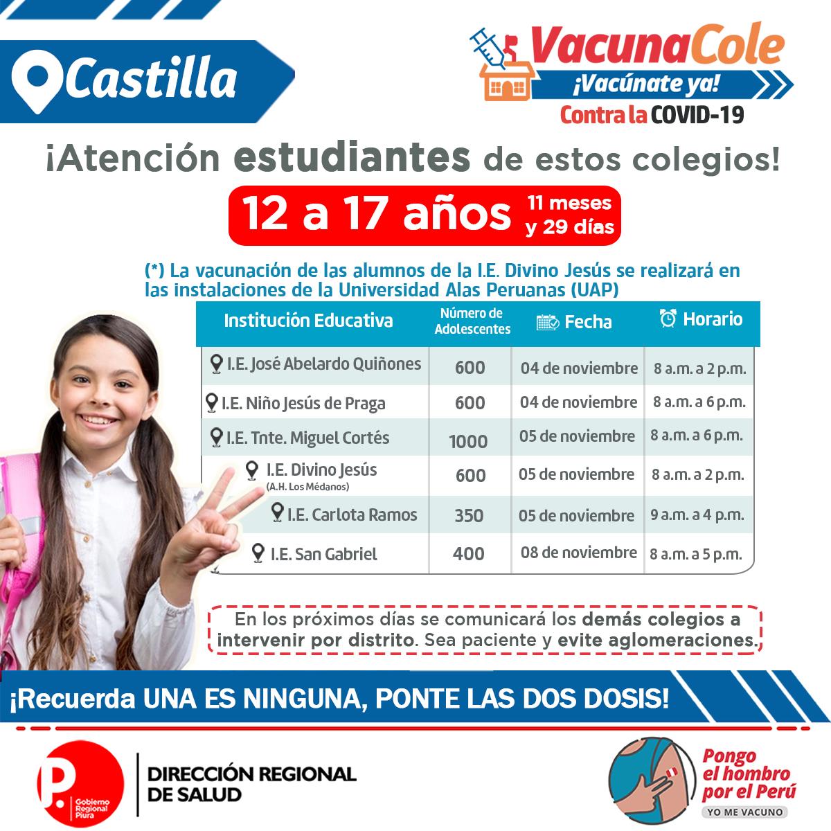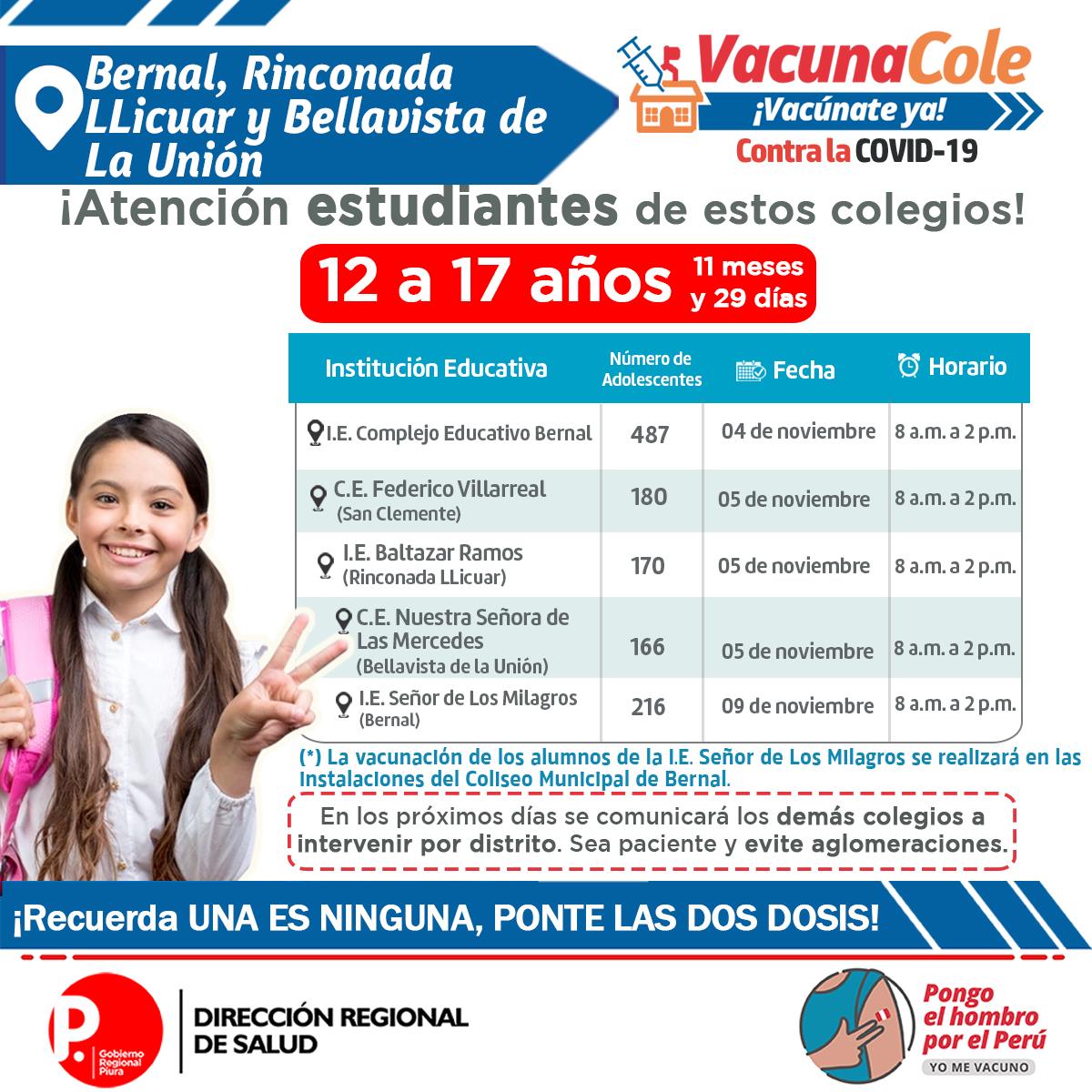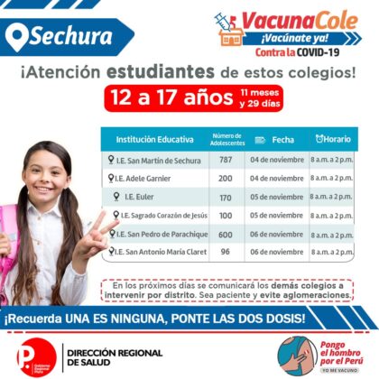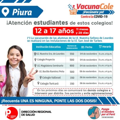 La vacunación contra la covid a menores de 12 a 17 años continúa en la región Piura. La Dirección regional de Salud continúa ampliando los colegios para que sus escolares reciban la primera dosis contra la covid.