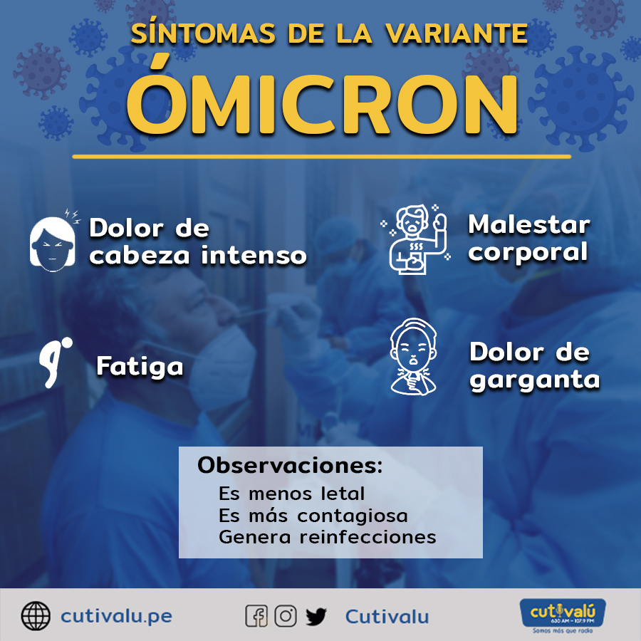 El médico infectólogo, César Guerrero Ramírez, remarcó que los principales síntomas de la variante Ómicron son el malestar corporal, dolor de cabeza intenso y fatiga. “Es muy importante que todo paciente que tenga estos síntomas o algún cuadro respiratorio, moquito o pequeño dolor de garganta, aunque no tenga pérdida del olfato, debe acudir al establecimiento de salud para que le realicen la prueba antigénica”, puntualizó.