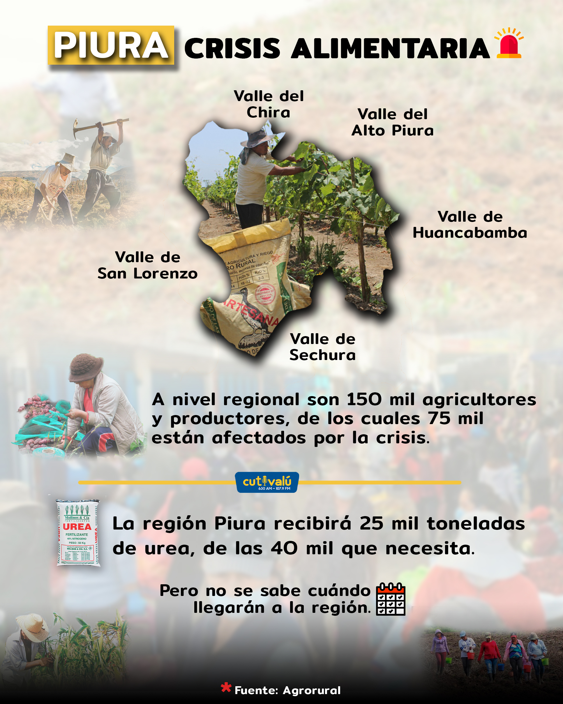 El jefe de la Unidad Zonal del Programa de Desarrollo Productivo Agrario Rural (Agrorural) de Piura, Gonzalo Cruz Abarca, informó que para esta región se ha destinado un total de 25 mil toneladas de fertilizantes nitrogenados (urea) que servirán para cubrir las necesidades de los agricultores piuranos afectados por la crisis del alto precio de los fertilizantes y la poca producción de alimentos a causa del mismo.