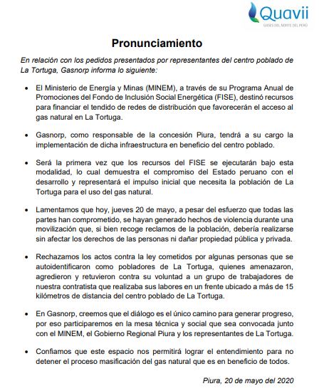 Por su parte, la empresa Gasnorp, a través de un comunicado, mostró su rechazo ante los hechos ocurridos en el paro. Según señaló, los pobladores “amenazaron, agredieron y retuvieron contra su voluntad a un grupo de trabajadores de la contratista”. Asimismo, Gasnorp indicó que espera continuar con la masificación del gas natural y establecer una mesa técnica junto al Ministerio de Energía y Minas y el Gobierno regional de Piura para llegar a un acuerdo respecto a la cantidad de viviendas de La Tortuga que serán beneficiadas con el proyecto.