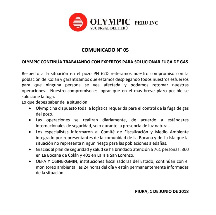 Se espera que para el lunes continúen las reuniones de la mesa de diálogo instalada, para conseguir que Olympic les reconozca los daños al medio ambiente, a los cultivos agrícolas y a la población. Los pobladores exigen 10 millones de dólares, así como otros reclamos presentados desde el 2017.