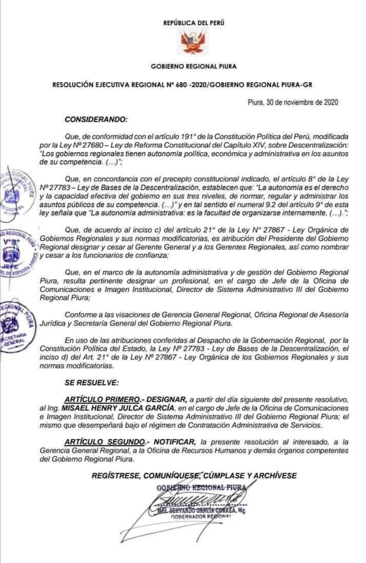 Mediante resolución N° 680-2020, el gobernador regional de Piura, Servando García Correa, dispuso la designación del ingeniero industrial Misael Henry Julca García en el cargo de jefe de la Oficina de Comunicaciones e Imagen Institucional.
