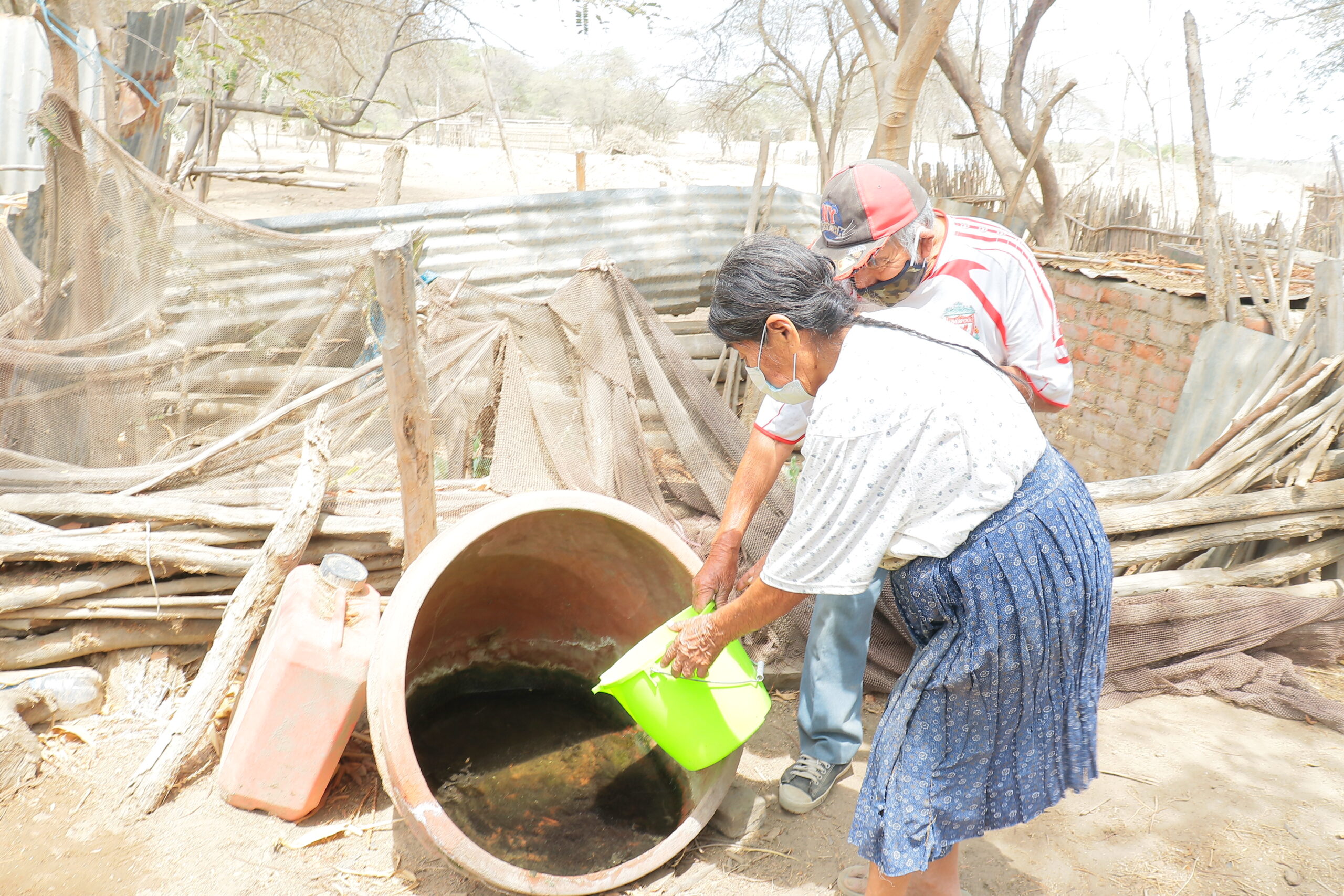 Severina Yovera Sernaqué es una mujer de 60 años que sufre una odisea para conseguir agua para su familia, especialmente para los cuatros niños que viven en su casa. “Yo puedo juntar una tinajita de agua y así tenemos que hacerlo durar hasta dos días por lo menos”, cuenta la sexegenaria mientras coge de la mano a una de las menores que la acompaña constantemente en sus quehaceres.