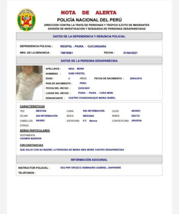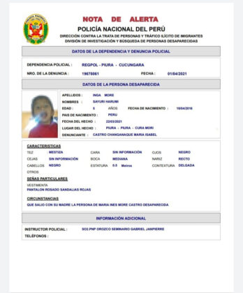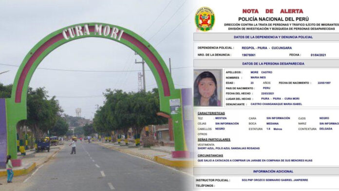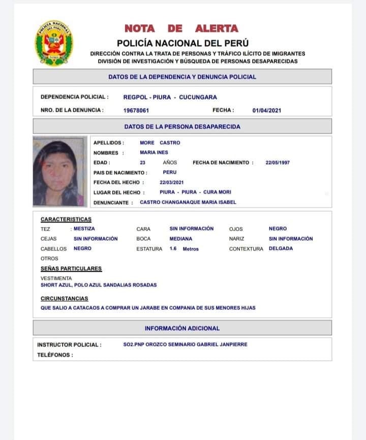 La Comisaría de Cucungará, en el distrito de Cura Mori, ha emitido la alerta informativa sobre la desaparición de Maria Inés More Castro, de 23 años, y sus dos  las hijas, Sayuri Harumi Inga More, de cinco años y Gabi Cristel Inga More, de dos, quienes fueron reportadas como desaparecidas desde el 22 de marzo en el centro poblado Almirante Miguel Grau.