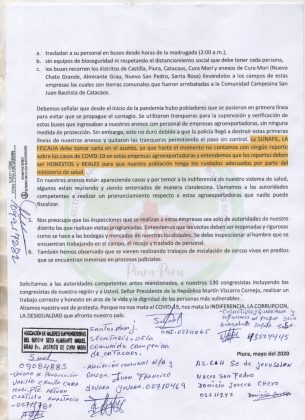 Los pobladores del Km 980 de la vía Piura – Chiclayo denuncian que las agroexportadoras que laboran cerca de ellos no cumplen con los protocolos de bio seguridad para evitar el contagio del nuevo coronavirus.