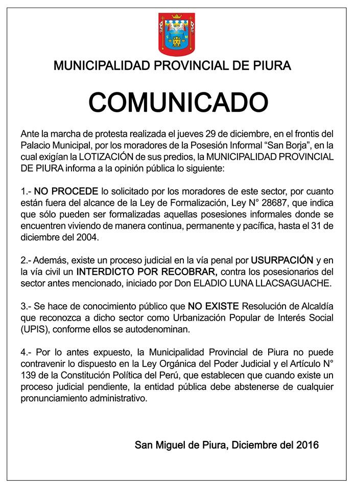 Finalmente, la municipalidad de Piura, aclara que “no existe Resolución del Alcaldía que reconozca al sector San Borja, como una Urbanización Popular de Interés Social, tal como los mismos pobladores se autodenominan”.