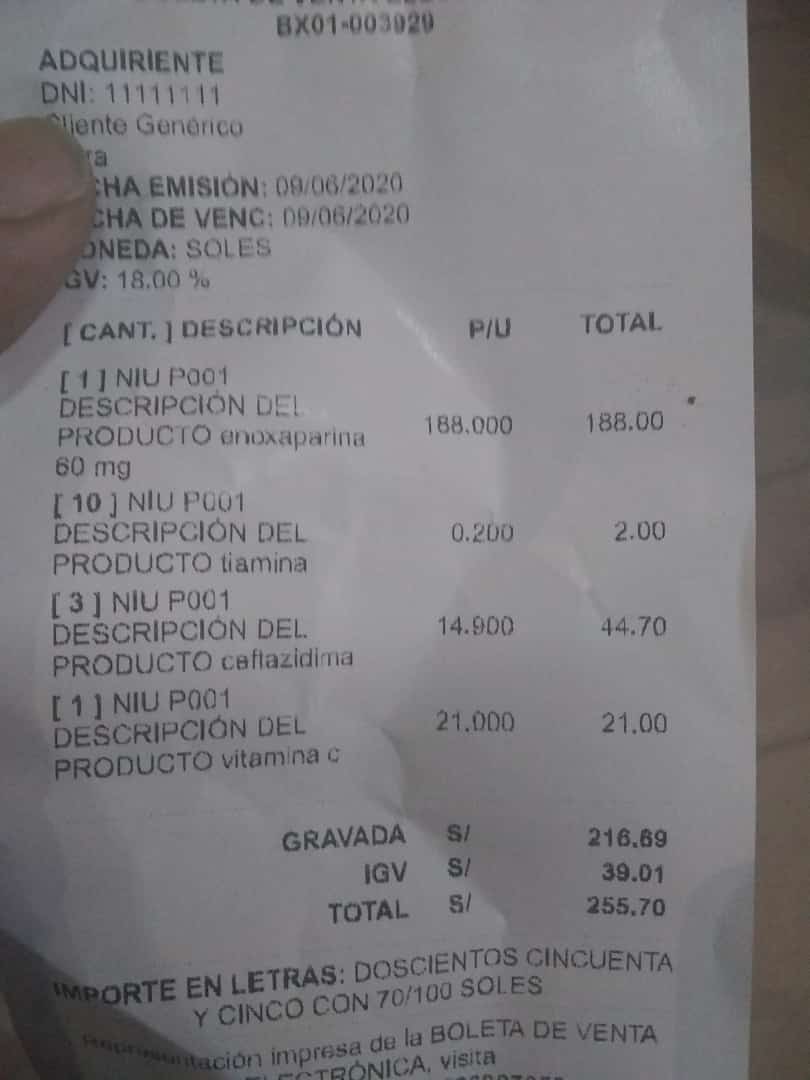 Este anticoagulante en su presentación de 60 mg (la más requerida) cuesta entre 45 y 55 soles, pero los familiares han tenido que pagar entre 120 a 188 soles por cada dosis. Así lo demuestra la receta de don Segundo, quien el martes 9 de junio debió prestar dinero a unos amigos para comprar la medicina que le piden en el Santa Rosa donde es atendido su padre.