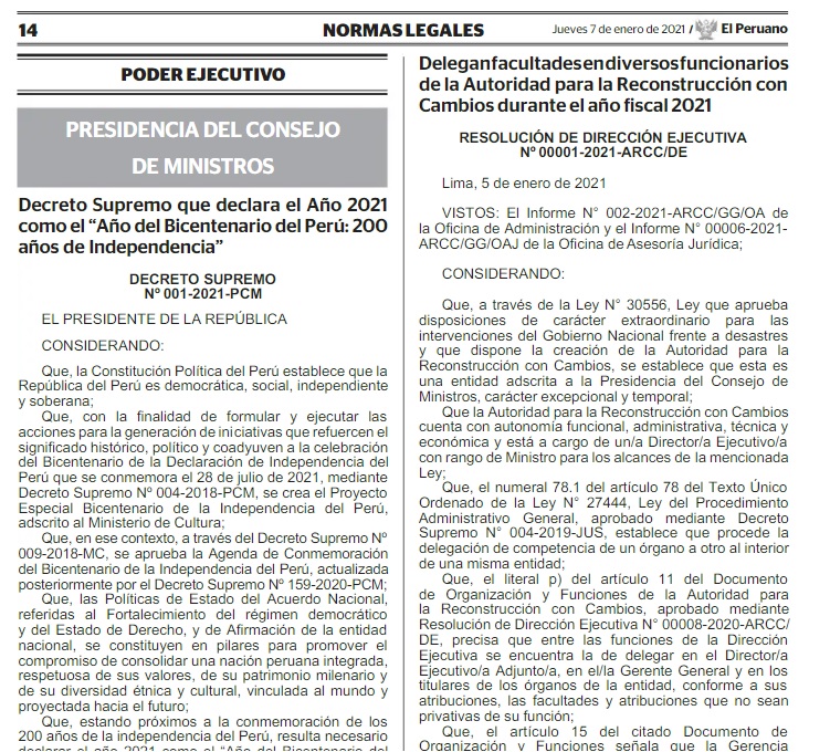 La Presidencia del Consejo de Ministros declaró el 2021 como el “Año del Bicentenario del Perú: 200 años de independencia”, nombre que debe ser consignado en los documentos oficiales.
