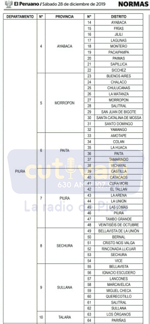 En el caso de la región Piura, la declaratoria de emergencia involucra a 51 distritos de todas las provincias, excepto Huancabamba la cual fue declarada en emergencia hace unas semanas cuando se activaron varias quebradas debido a las fuertes lluvias que caen en la zona.
