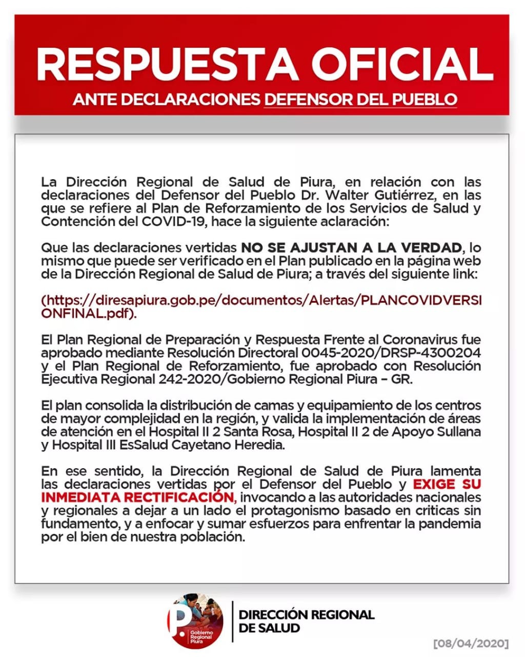 Por su parte la Dirección Regional de Salud de Piura emitió un comunicado en el que niega las acusaciones de plagio.