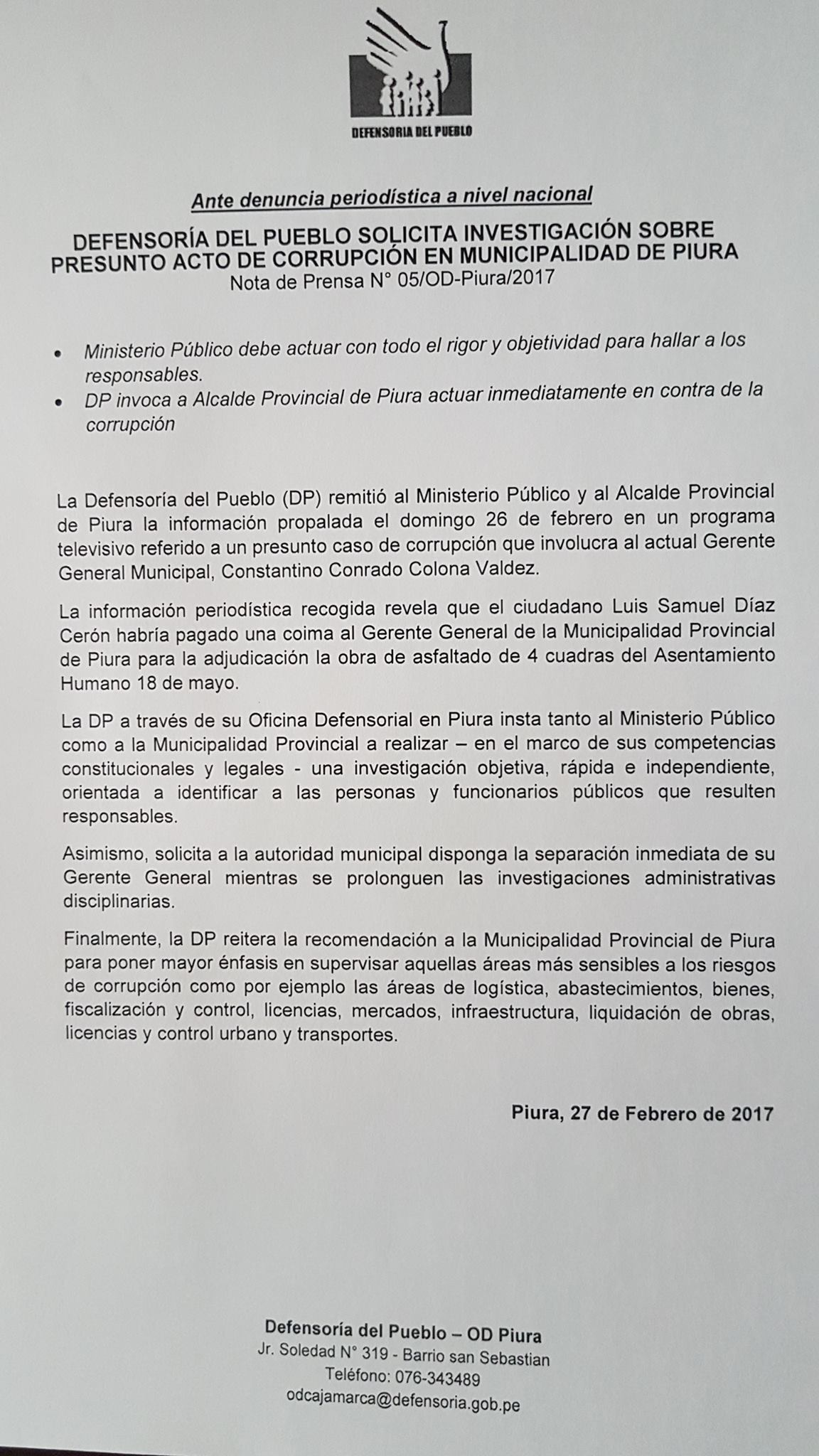 La Defensoría del Pueblo en Piura exige una investigación sobre el presunto acto de corrupción en la municipalidad provincial que involucra al actual general municipal, Constantino Colona Valdez.