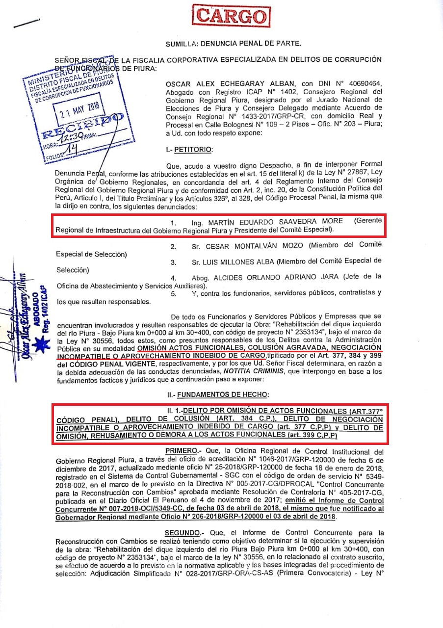 El consejero regional por Morropón, Óscar Echegaray Albán, precisó que los denunciados son Martín Eduardo Saavedra More, presidente del Comité especial de selección del consorcio que ejecute el proyecto; lo miembros del comité, Luis Millones Alva y César Montalván Mozo; y el jefe de Abastecimiento, Orlando Adriano Jara.