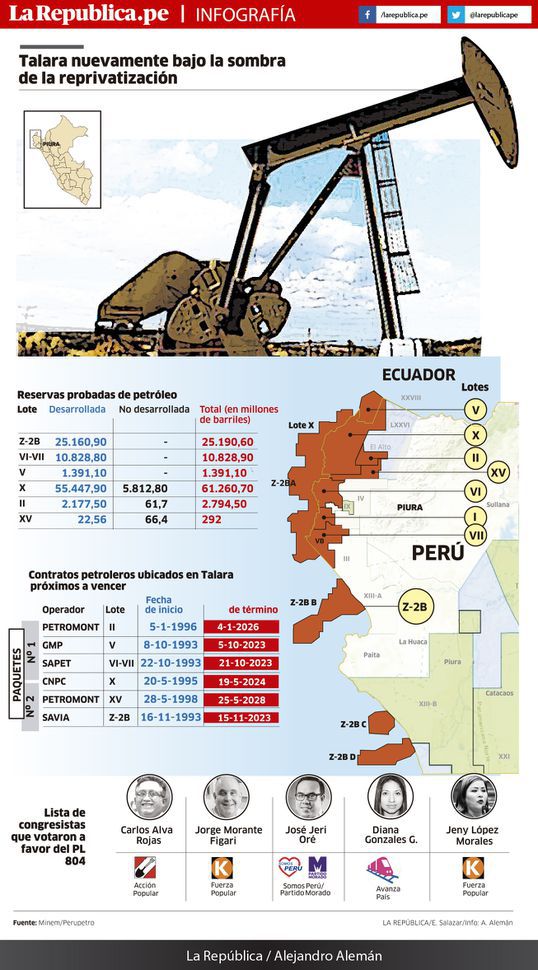 Seis contratos en Talara están próximos a culminar: Sapet (Lote VI-VII, 2023), UNNA (Lote V, 2023), Savia (Lote Z-2B, 2023), CNPC (Lote X, 2024), y Petromont (Lote II, 2026; Lote XV, 2028).