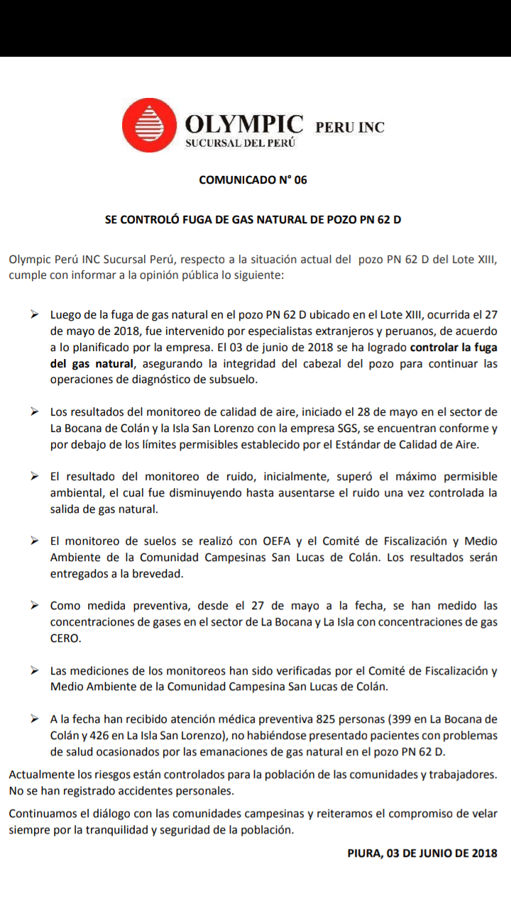 Por su parte, Olympic informó que luego de la intervención de especialistas extranjeros y peruanos este domingo 3 de junio de 2018 se ha logrado controlar la fuga