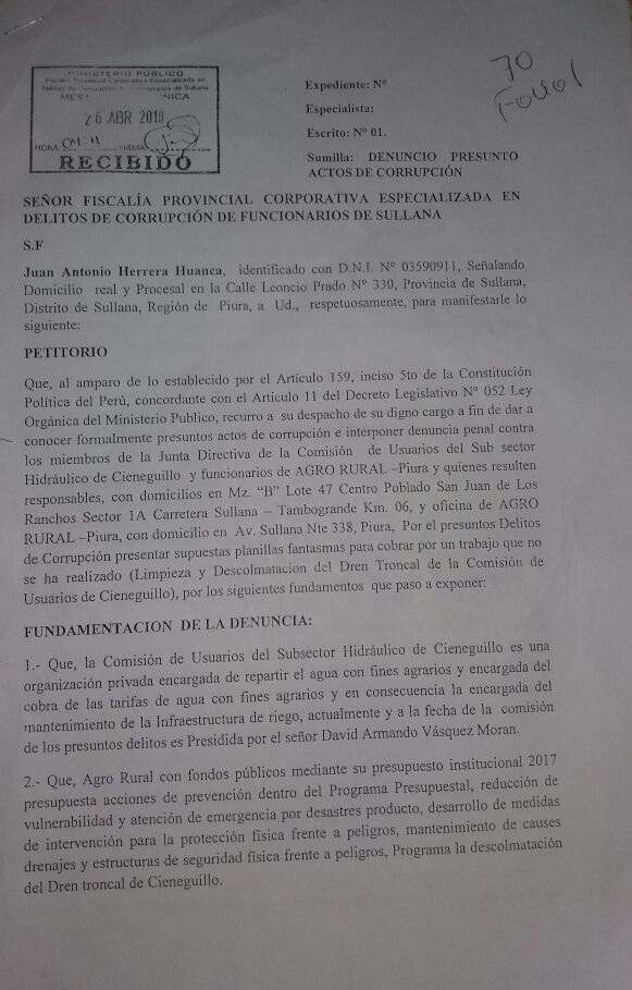 Directivos de la Comisión de Usuarios del Subsector Hidráulico de Cieneguillo fueron denunciados ante la Fiscalía de Sullana por presuntamente haber beneficiado a delegados y trabajadores de la institución, así como a sus familiares con parte de los S/ 220.140 que el Estado destinó para la descolmatación del dren Cieneguillo.