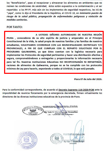 En este memorial también refieren que la mayoría de instituciones educativas ya han cumplido con entregar los alimentos que tenían en su poder, usando materiales de protección a su alcance, lo que trajo consigo un gran número de infectados, algunos de los cuales han fallecido.