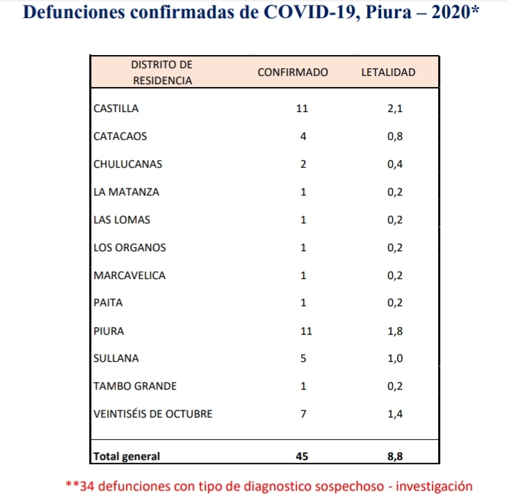 Sin embargo, mediante el informe N°012-2020 el director de Inteligencia Sanitaria de la Dirección Regional de Salud Piura, Luis Lecca Reyes, mostró su disconformidad con las cifras emitidas por el Ministerio de Salud y asegura que hasta la fecha son 45 personas las que han perdido la vida en la región a causa del coronavirus.