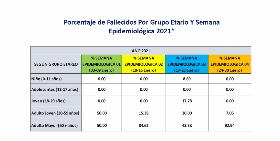 Otro dato que vale la pena tomar en cuenta es que, a partir de la tercera semana de enero, el 8.89% de fallecidos por la covid fueron niños de 0 a 11 años, mientras que 17.78% fueron jóvenes de 18 a 29 años. Sin embargo, en la cuarta semana ya no se reportaron muertes en estos grupos poblacionales.
