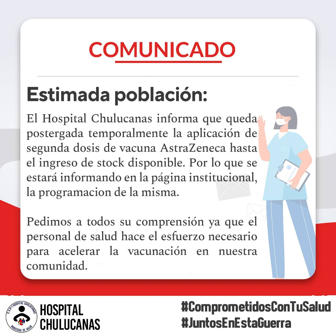 Mediante un pronunciamiento el Hospital de Chulucanas anunció a la población que está agotada la vacuna Astrazeneca para la aplicación de la segunda dosis hasta el nuevo ingreso de stock disponible.