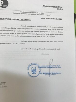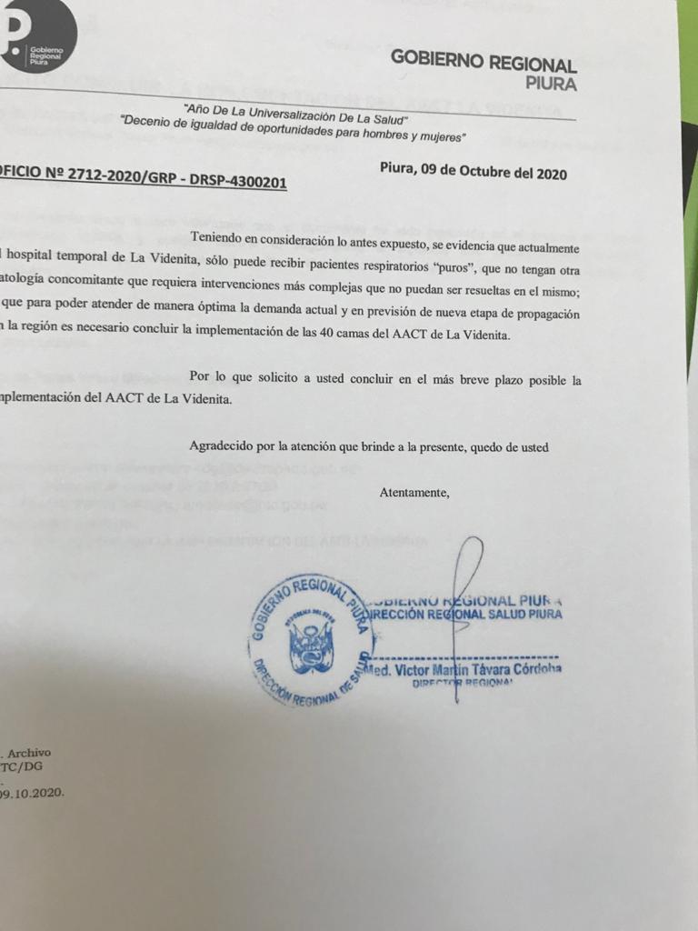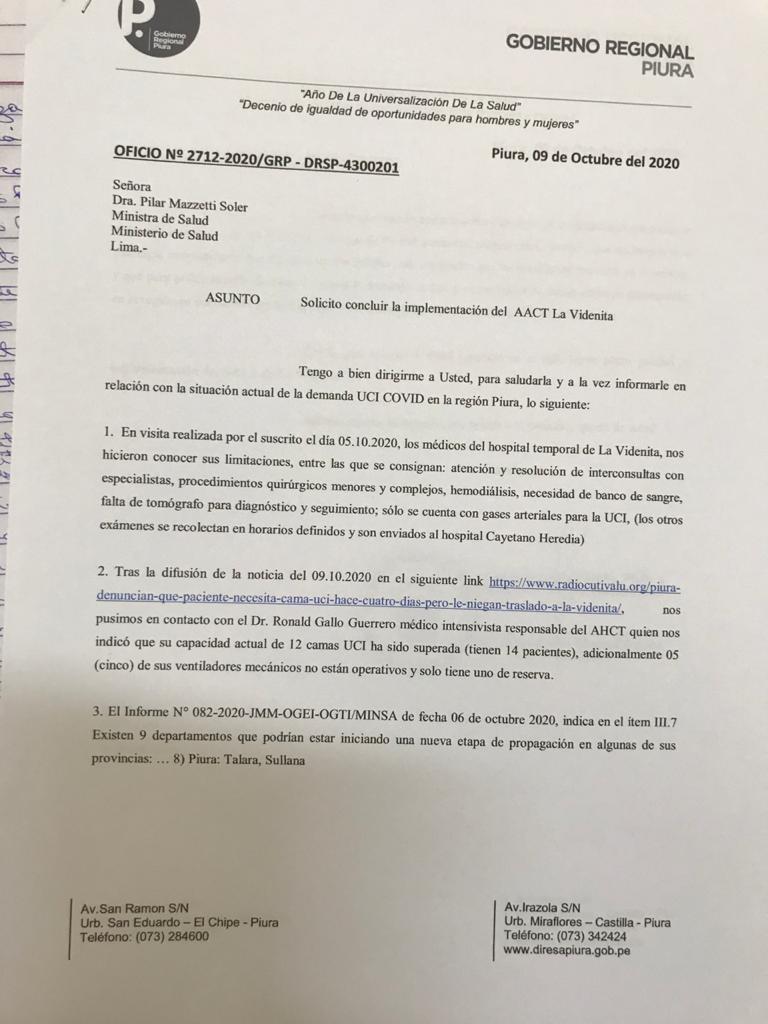 Ante la alerta por una segunda ola de contagios en el país y la falta de camas UCI en Piura, el 10 de octubre la Dirección regional de salud envió un oficio al Ministerio de Salud (MINSA) solicitando que culmine la implementación de las 20 camas UCI pendientes en el hospital temporal de La Videnita, ubicado en Veintiséis de octubre.