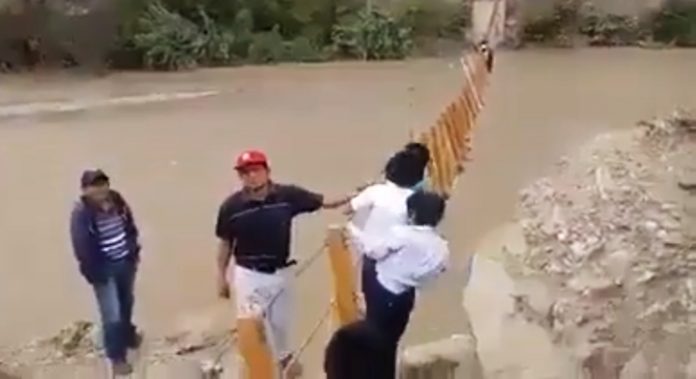 Por ello exigió que apuren las gestiones para la construcción de un nuevo puente pues los palos y sogas que ahora les sirven para trasladarse son un verdadero peligro para los pobladores y escolares que diariamente deben pasar para realizar sus actividades académicas o a la chacra.