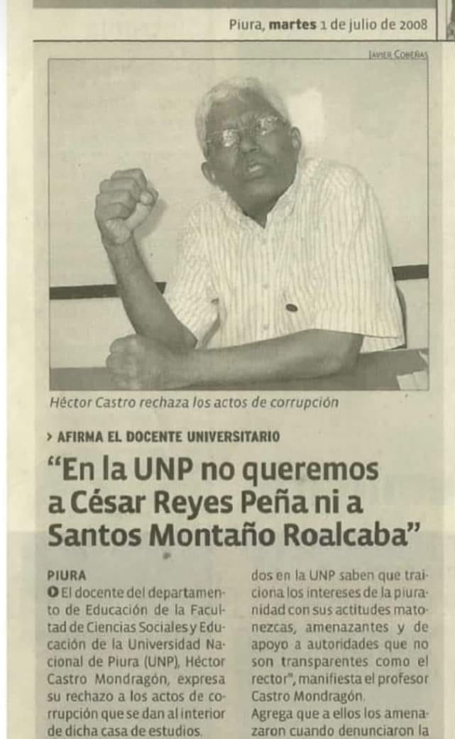 Héctor Castro parece que cambió de discurso puesto que, en el año 2008, el diario Correo le hizo una entrevista donde enfatizó que en la universidad de todos los piuranos no querían ni a César Reyes Peña, actual rector, y a Santos Montaño, candidato a quien ahora apoya.
