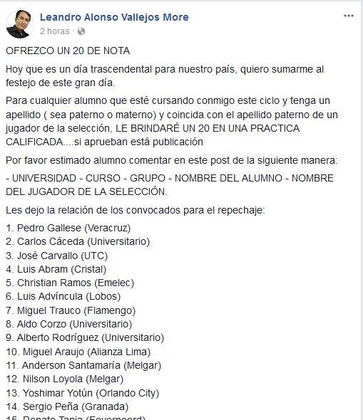 “Ofrezco un 20 de nota […] Para cualquier alumno que esté cursando conmigo este ciclo y tenga un apellido (sea paterno o materno) y coincida con el apellido paterno de un jugador de la selección, le brindaré un 20 en una práctica calificada”, señala en su último post en las redes sociales.