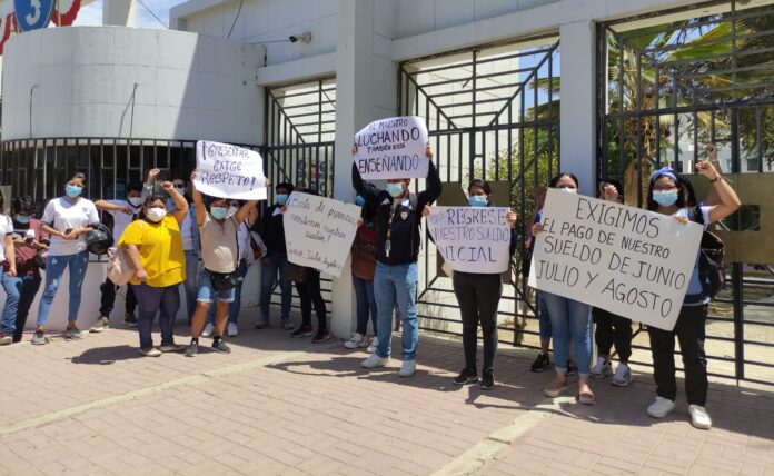 Más de 30 docentes del colegio Carlota Ramos de Santolaya protestaron la mañana del viernes 17 de septiembre en el exterior de la Universidad Nacional de Piura (UNP) para exigir el pago de sus salarios que les deben desde hace cuatro meses.