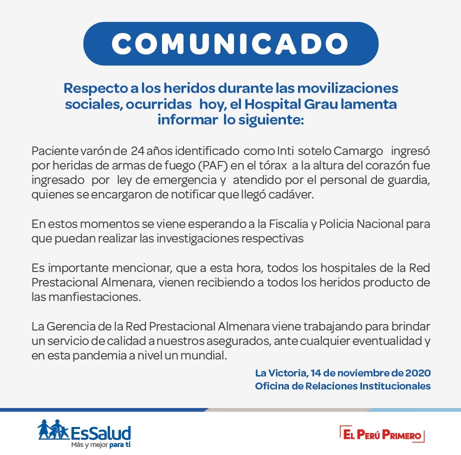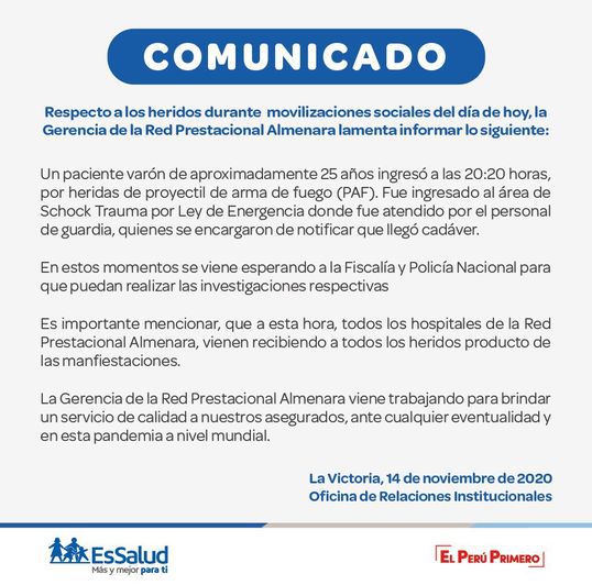 El Seguro Social (EsSalud) se pronunció sobre el asesinato del manifestante. Informó que el joven llegó cadáver, por lo que se espera la presencia de la Fiscalía.