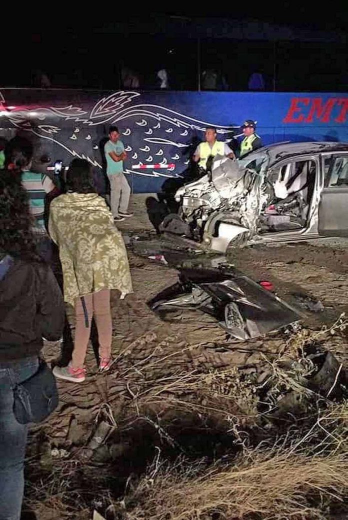 El hecho se registró cerca de la medianoche en el km 63 de la Panamericana Norte, donde, por causas que son de materia de investigación policial, un ómnibus de la empresa Ave Fénix Sac (Entrafesa), con placa de rodaje T7N-961, impactó frontalmente contra un vehículo beige de placa P3V-485.