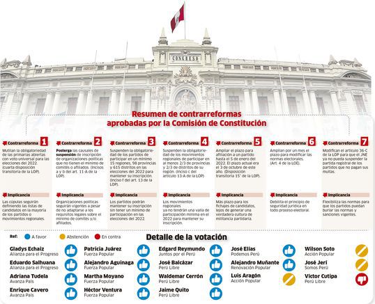 Además ampliaron hasta el 5 de enero del 2022 el plazo para las afiliaciones a los partidos, lo que se puede interpretar como un mayor tiempo para los fichajes de candidatos, debilitando la cultura de filiación. Las siete contrarreformas (ver infografía) ahora pasarán al pleno.