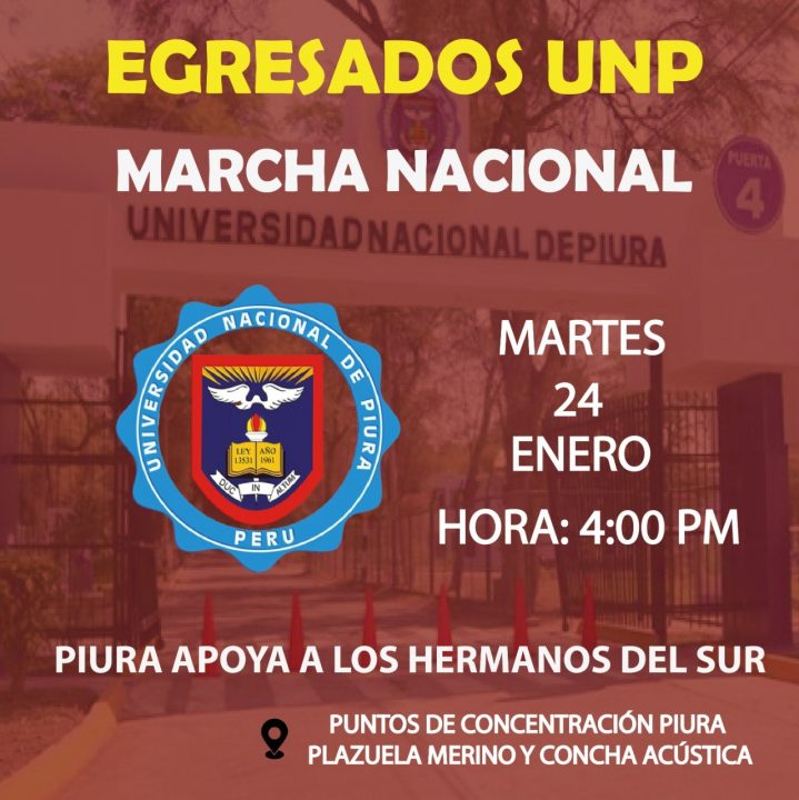 Un grupo de egresados de la Universidad Nacional de Piura (UNP) ha convocado a una marcha para este martes 24 de enero a las 4 p. m. en la Plazuela Merino. Esta protesta pacífica se realiza en apoyo a las movilizaciones nacionales que se han convocado para el día de hoy a nivel nacional.