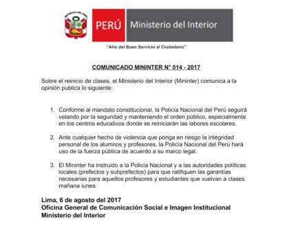 El Ministerio del Interior del Perú emitió un comunicado en su página oficial de Facebook , señalando que la policía actuará ante cualquier hecho de violencia que ponga en riesgo la integridad de los alumnos y profesores.