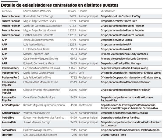 Una veintena de exparlamentarios de distintas gestiones pasadas regresaron al Congreso a trabajar en cargos de confianza, con sueldos que oscilan entre los cinco mil y once mil soles, según se desprende de la planilla de personal publicada en el Portal de Transparencia.