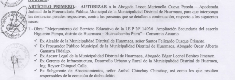 Benites Jiménez fue asesor jurídico en la gestión del exalcalde de Huarmaca, Santos Felizardo Cuzque Crisanto, y se le inició la investigación por la obra “Mejoramiento del servicio educativo de la I.E Nº 14936 Ampliación secundaria del caserío Higueron Pampa, distrito de Huarmaca”, a favor del consorcio Acuario.