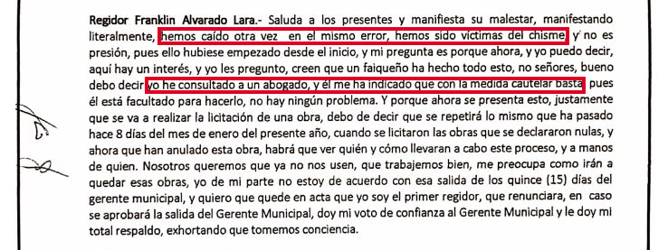 En sesión de concejo extraordinaria N° 007-2019 llevada a cabo el 18 de noviembre, el regidor Franklin Alvarado Lara, alega que la situación del gerente se debe a “chismes”. Considera que “la medida cautelar basta” para que el mencionado gerente continúe en el cargo, pese a la inhabilitación de la Contraloría.