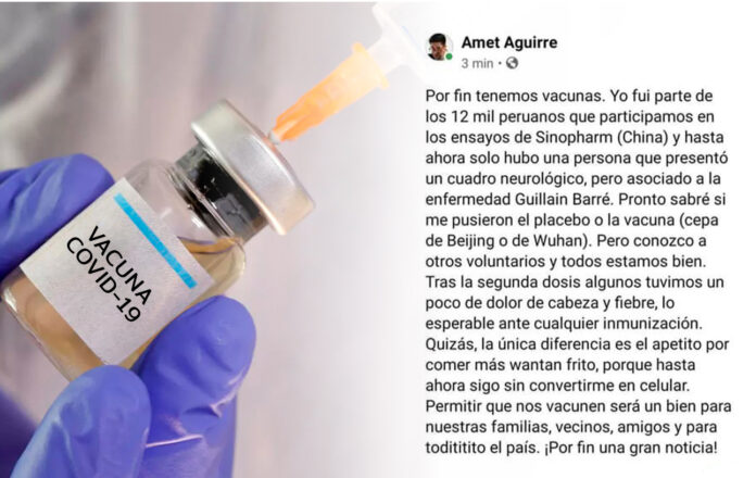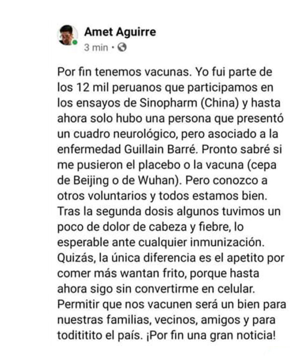 “Pronto sabré si me pusieron el placebo o la vacuna (cepa de Beijing o de Wuhan), pero conozco a otros voluntarios y todos estamos bien”, narró Amet Aguirre en su cuenta de Facebook.