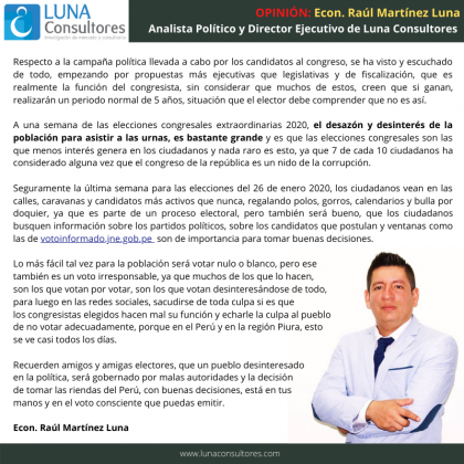 A una semana de las elecciones congresales extraordinarias 2020, el desazón y desinterés de la población para asistir a las urnas, es bastante grande y es que las elecciones congresales son las que menos interés genera en los ciudadanos y nada raro es esto, ya que 7 de cada 10 ciudadanos ha considerado alguna vez que el congreso de la república es un nido de la corrupción.