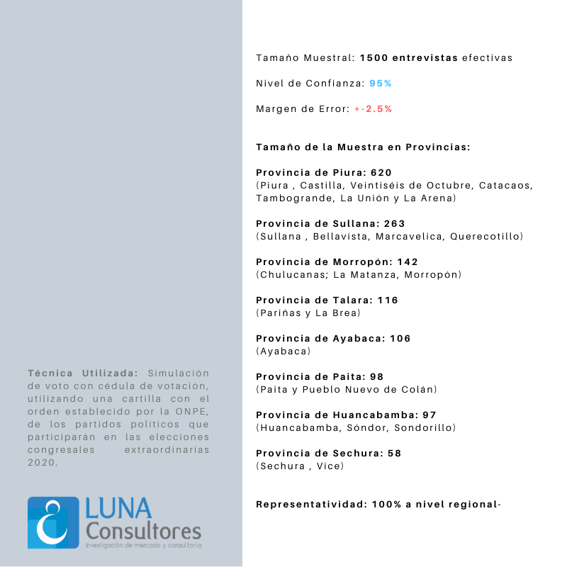 El presente estudio de opinión se realizó en las 08 provincias de la región Piura, tomando en consideración a los distritos más importantes de cada provincia, teniendo un total de 1500 personas entrevistadas, bajo la metodología de simulación de voto, en la que cada ciudadano, en forma anónima, marcó el símbolo del partido político por el cuál votaría y escribió el número, en caso tenía un voto preferencial hacia algún candidato congresal.