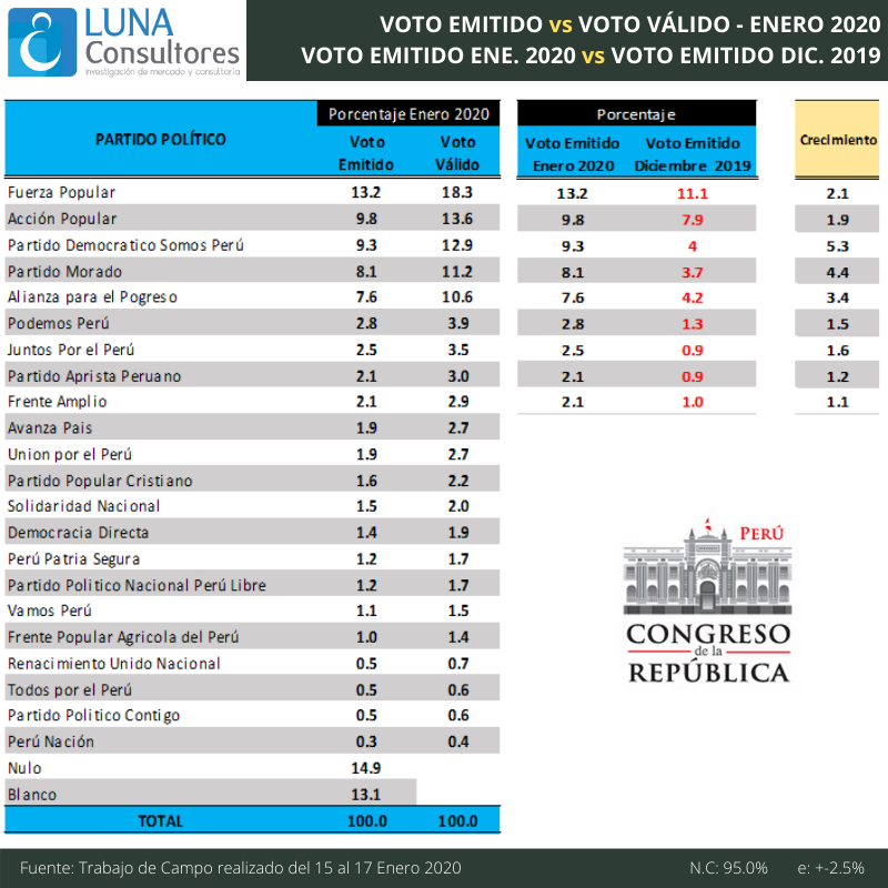 El partido de Fuerza Popular se mantiene en la primera posición con 13.2%, en comparación a los primeros estudios realizados por Luna Consultores desde el mes de noviembre 2019, sin embargo, el segundo lugar, actualmente ocupado por Acción Popular con 9.8%, tiene a Somos Perú, el Partido Morado y Alianza para el Progreso, con 9.3%, 8.1% y 7.6% respectivamente, es decir, considerando el margen de error del presente estudio (+-2.5%) a una semana de que los electores ingresen a las urnas, cualquier cosa podría pasar, por ello, es importante que se tenga claro, que una encuesta, representa la fotografía de un momento, en este caso, representa la opinión de los electores del 15 al 17 de enero 2020, fecha en la que se realizó el trabajo de campo.