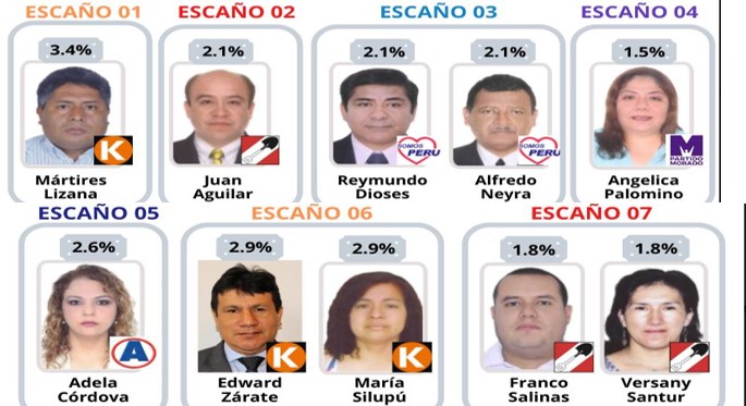 Según los resultados obtenidos y aplicando el método D´HONT, Fuerza Popular al igual que Acción Popular, colocaría 02 congresistas cada partido político, correspondiendo 01 escaño para el partido Somos Perú, Morado y Alianza para el Progreso.