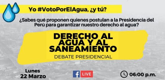 En el marco del Día Mundial del Agua, candidatos y una candidata a la presidencia de la República participarán en un debate sobre el derecho de acceso al agua y a los servicios de saneamiento. Han confirmado su participación George Forsyth (Victoria Nacional), Ollanta Humala (Partido Nacionalista Peruano), Verónika Mendoza (Juntos por el Perú), Julio Guzmán (Partido Morado) y Marco Arana (Frente Amplio). Se espera aún la confirmación de … Sigue leyendo Elecciones 2021: candidatos presidenciales debatirán sobre el derecho al agua