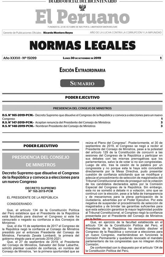 De acuerdo al Decreto Supremo publicado ayer mismo en el diario oficial El Peruano, Vizcarra decretó “convocar a elecciones para un nuevo congreso para el domingo 26 de enero de 2020 para que complete el periodo constitucional del Congreso disuelto, incluida la Comisión Permanente”.