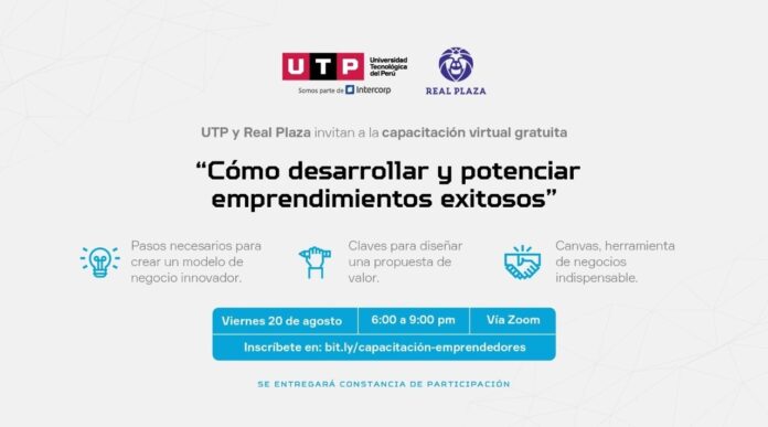 Real Plaza y la Universidad Tecnológica del Perú (UTP) se unen para brindar la capacitación virtual gratuita “Cómo desarrollar y potenciar emprendimientos exitosos”, dirigida a piuranos emprendedores o con interés en temas de emprendimiento.