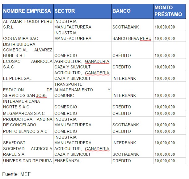 De estas 80 empresas, un privilegiado grupo de 13 accedieron al monto máximo ascendente a S/ 10 millones. Entre estas, figuran empresas dedicadas al rubro de la industria pesquera y agrícola; distribuidoras de alimentos, automotriz, y una universidad.