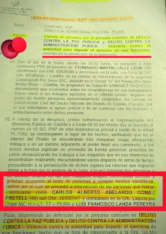 La sentencia a La Gran Cruz también menciona a Alberto Gómez de la Torre Pretell, actual apoderado de la Constructora Miraflores Perú SAC. El 14 de agosto de 2012, según se lee en la sentencia, dos comuneros de Castilla denunciaron que una treintena de personas «bajo amenaza no los dejaban ingresar a sus tierras». Sobre esa ocasión, Wayka tuvo acceso a un parte policial que muestra que la policía detuvo a de la Torre Pretell por el presunto delito contra la paz pública, cuando un grupo de 30 hombres irrumpían con palos y tractores sobre las tierras de Castilla.