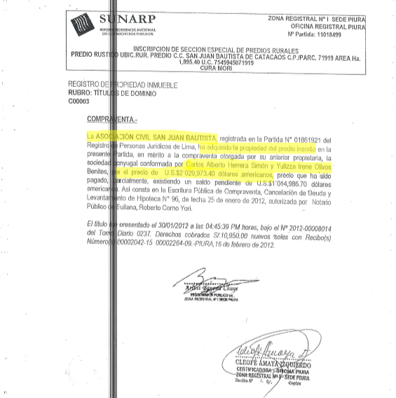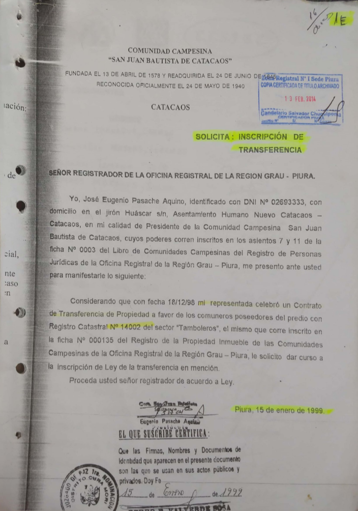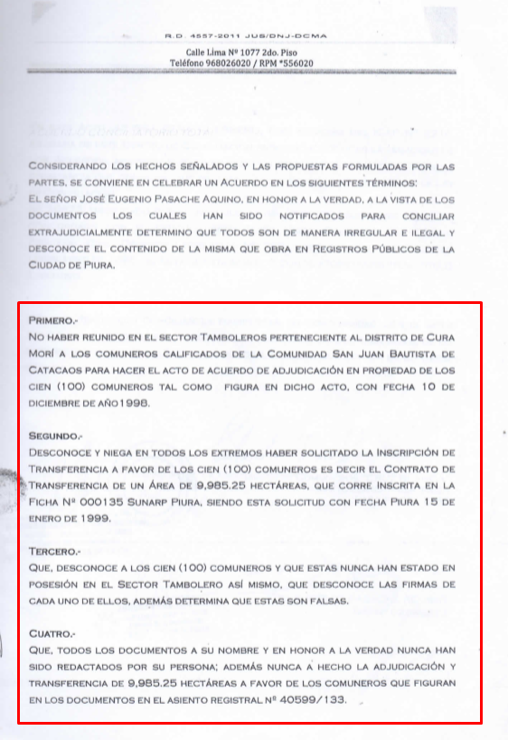 Un mes después de esa supuesta asamblea, el 15 de enero de 1999, según las actas de la época, la firma del presidente de la comunidad, José Eugenio Pasache Aquino, apareció en la irregular transferencia. Sorprendido, casi 15 años después, al enterarse de lo sucedido, el mismo José Pasache se vio en la obligación de firmar un acta de conciliación en la que negó haber firmado la transferencia y determinó que los documentos redactados en esa supuesta asamblea son falsos.